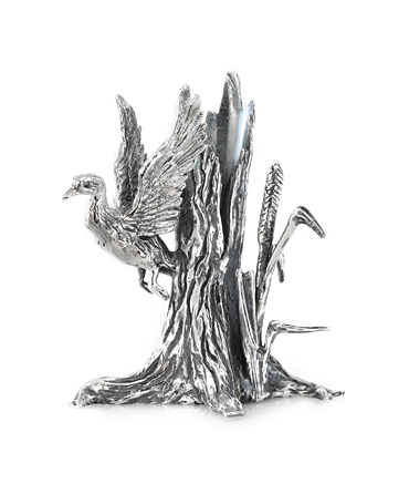 Серебряная подставка под ручку "Охота" доступна в нашем магазине по предварительному заказу. Оригинальное украшение для письменного стола изготовлено вручную из серебра высшей пробы. Изделие представляет собой пень, из-за которого взлетает дикая птица - будущий охотничий трофей. Пень как раз и призван использоваться как подставка для ручки, карандаша или небольших ножниц. Подставка "Охота" упакована в подарочный футляр и может послужить прекрасным сувениром вне зависимости от повода.