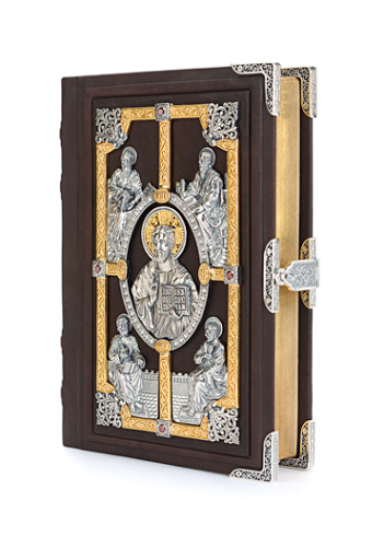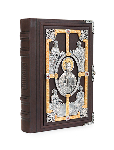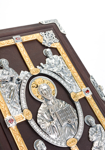 Самая дорогая и роскошная Библия из коллекции «Альтмастер». Переплет книги изготовлен из натуральной телячьей кожи и вручную украшен серебряным окладом высокой степени проработки.На замке книги стоят клейма мастерской и пробирной палаты.