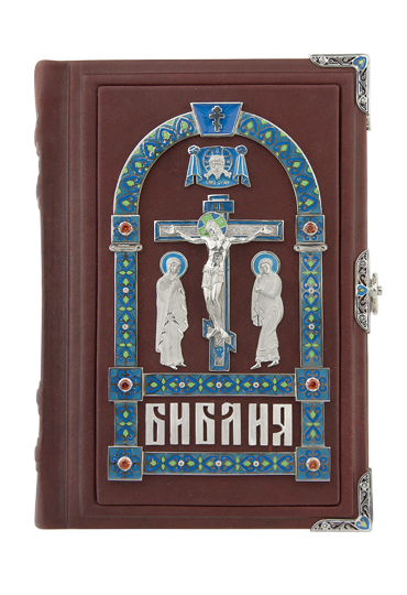 Библия с эмалью - это потрясающее издание главной книги христианского мира. Общий вид напоминает старинный фолиант с обложкой из кожи ручной выделки и отделкой перегородчатой эмалью. Книга содержит синодальный текст Священного Писания, дополненный текстами Ветхого и Нового заветов. Основой для печати послужила рисовая бумага с золотым обрезом. В работе над окладом для каждого экземпляра используются 7 камней циркония и, в среднем, 140 граммов серебра высшей пробы. Центральное место композиции серебряного оклада занимает изображение распятие Иисуса Христа со стоящими по бокам от него фигурами Иоанна Богослова и Божьей Матери. Использование перегородчатой эмали придаёт изделию дорогой и необычайно радующий взгляд вид. Книга в уникальной обложке доступна только по предварительному заказу. Фолиант продаётся в подарочном футляре и транспортировочной коробке. Данное издание Библии может стать семейной реликвией, бережно хранимой и передаваемой по наследству или послужить драгоценным подарком для глубоко уважаемого вами человека, исповедаюещего христианство.