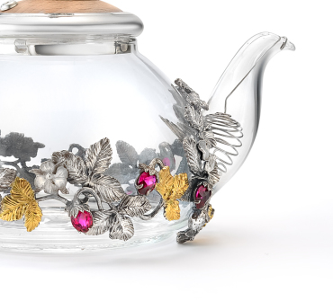 Сосуд чайника «Земляника» выполнен из термостойкого стекла украшенного серебром. Изящные формы, в сочетании с особым стеклом, помогают в полной мере раскрыть чайный букет, получая эстетическое удовольствие от чайной церемонии. Крышка изготовлена из дуба, пропитанного для придания водоотталкивающих свойств дереву, льняным маслом. Ягодки сделаны из десятка корунд-рубинов изящной огранки. Детали, выполненные вручную, передают задумку автора – летнее настроение, наслаждение чаепитием и красоту русской души. Произведение займет достойное место в коллекции серебра или станет прекрасным подарком для ценителей ювелирного искусства.