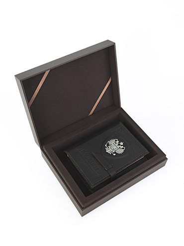 Блокнот «Держава» выполнен вручную из телячьей кожи. Украшен серебряным гербом России высокой степени проработки.