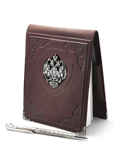 Блокнот "Империя" изготовлен вручную и высококачественной телячьей кожи. Поверхность обложки украшена величественным изображением герба царской Империи - двуглавым орлом, тиснением и аккуратно выполненными уголками. Все металлические предметы отделки изготовлены из серебра 925 пробы. На поверхность герба нанесены клейма пробирной палаты и мастерской. В обложку этого великолепного блокнота аккуратно вшита петля-держатель для серебряной ручки (ручка в комплект не входит). Внутрь обложки вставлен блок для записей формата А5, являющийся съёмным и легко заменяемым. Блокнот "Империя" удобен для личного использования, а также для подарка близкому человеку, коллеге или партнёру по бизнесу. Выбрав данный предмет для подарка, Вы оставите о себе добрую память.
