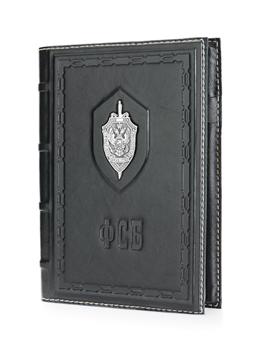 Ежедневник "Федеральная служба безопасности" представляет собой сменный блок мелованных недатированных листов с золотым обрезом, вставленных в кожаный переплёт. Переднюю часть обложки украшает изготовленный из серебра высшей пробы герб ФСБ, что, вероятно, делает ежедневник своего рода корпоративным подарком либо подходящим предметом для вручения знакомому вам представителю данной государственной службы. Серебряный герб отличает высочайшая степень проработки деталей, на его поверхность нанесены клейма пробирной палаты и мастерской. Изделие поставляется в подарочном футляре и доступно по предварительному заказу.