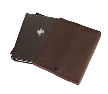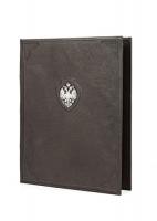 Фолдер представительского класса «Империя» выполнен вручную из телячьей кожи и украшен серебряным гербом царской России.