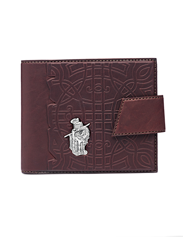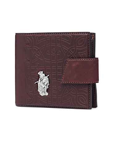 Кошелёк выполнен вручную из телячьей кожи и украшен серебряной плакеткой с былинным русским богатырем.