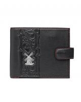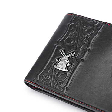 Кошелёк выполнен вручную из телячьей кожи и украшен серебряной плакеткой с мельницей. Ветряная мельница издревле являлась объектом верований и традиций. Древние славяне приписывали шуму мельницы, а также ее свойствам превращать силу одних стихий в другие, мистическое значение. В христианстве мельница является символом смирения и связан с представлением о справедливой судьбе, которая проводит человека через все испытания, чтобы он вернулся к своему истинному «Я», чистому и возвышенному.