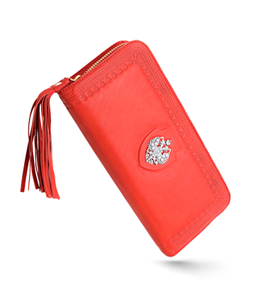 Женский кошелёк "Империя" выполнен вручную из телячьей кожи красного цвета с тиснением по периметру и с красной кожаной кисточкой на молнии. Изделие украшено изготовленным из серебра 925 пробы гербом царской России, на котором проставлены клейма мастерской и пробирной палаты. Кошелёк имеет размер, подходящий для хранения несложенных денежных купюр. Элегантно выполненный, может стать удачным подарком для прекрасной дамы.
