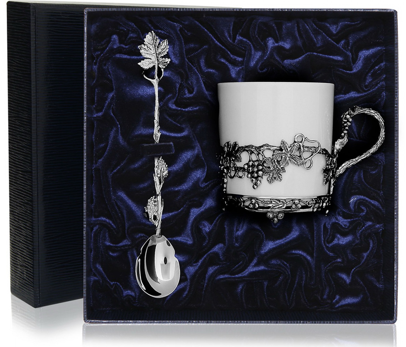Чашка кофейная "Виноград" с ложкой может послужить замечательным подарком или украсить ваш стол. Строгая форма фарфоровой кофейной чашки компенсируется нежным витым узором серебряного основания и изящной кофейной ложкой, украшенной по всей длине рукоятки виноградными листьями. Набор упакован в аккуратный футляр, удобный для транспортировки и вручения подарка.