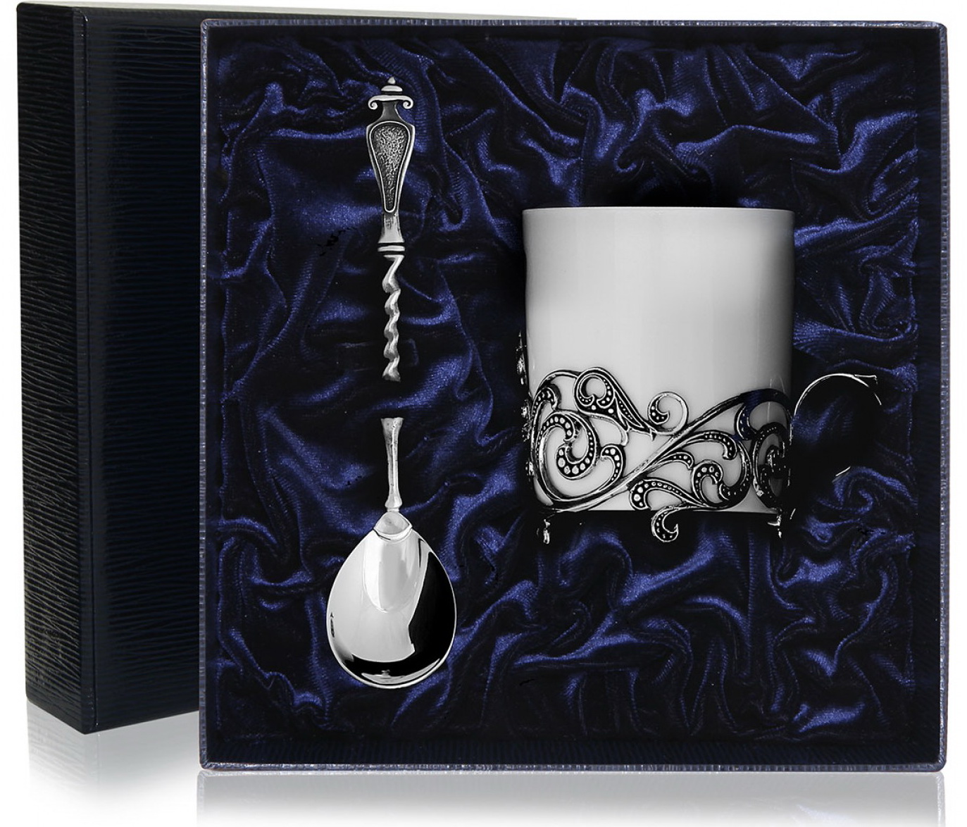 Чашка кофейная "Витая" с ложкой, упакованные в тёмно-синий футляр, послужат достойным подарком и будут радовать взгляд. Белая фарфоровая чашка с серебряным ободком изнутри, вставленная в красивейшее основание на изящных ножках, и серебряная кофейная ложка с рукояткой необычной формы притягивают к себе внимание безупречностью изготовления. В работе использовано серебро 925 пробы.