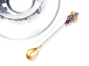 Чашка с блюдцем и ложкой "Земляника" изготовлены из термостойкого стекла с использованием серебра пробы 925. Оригинальным дополнением чашки служит основание с растительными мотивами. Изюминкой декоративной отделки чашки и серебряной чайной ложки являются вставки из красного и жёлтого корунда. Набор упакован в футляр и транспортировочную коробку и может стать уникальным подарком.