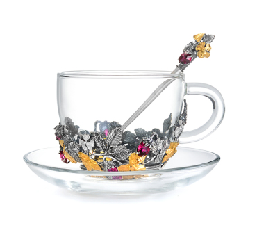 Чашка с серебром с блюдцем и ложкой "Земляника". Высота: 10,3 см. Ширина: 6,7 см. Артикул: SCH0041