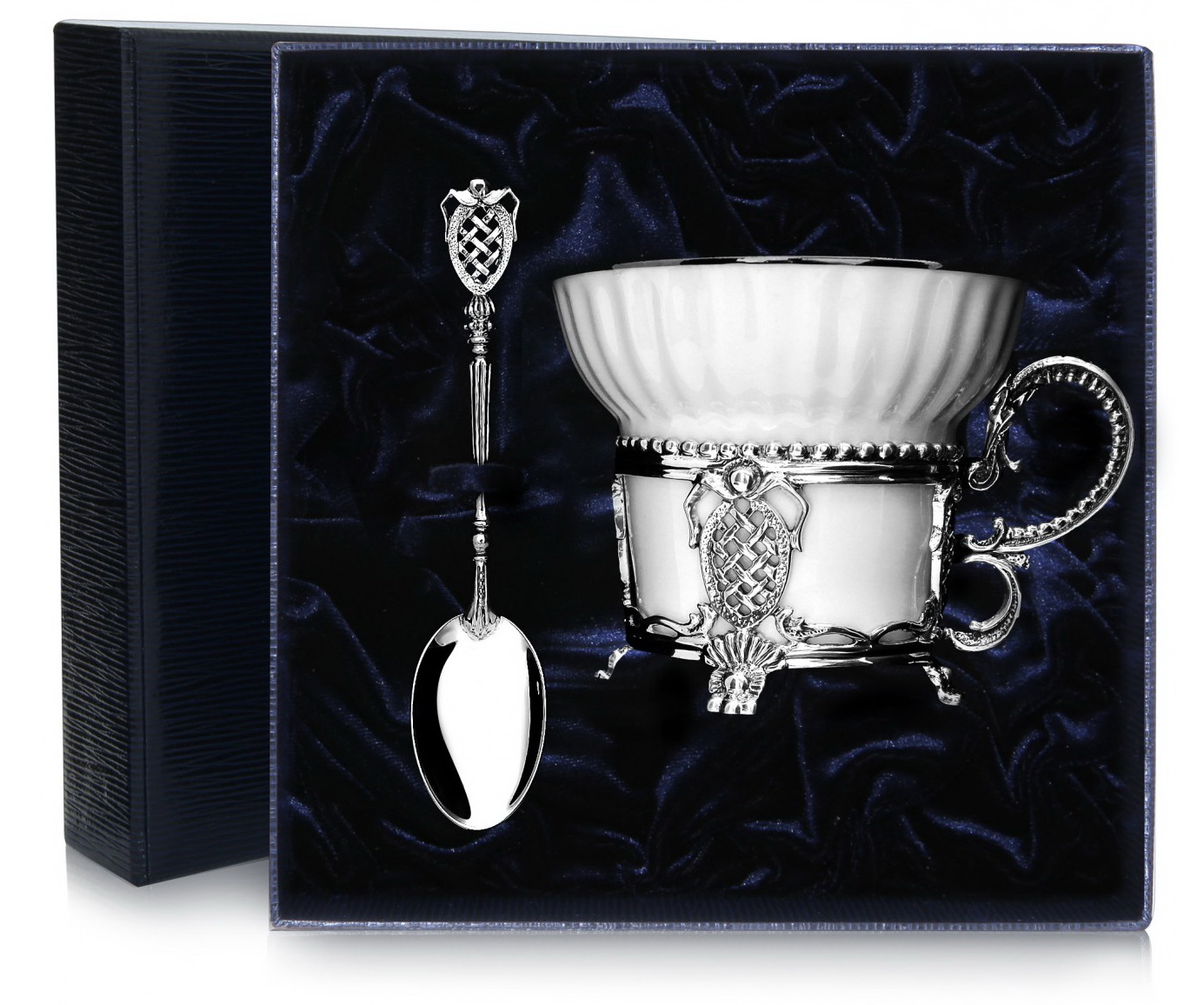 Чашка чайная "Меценат" с ложкой - это набор, состоящий из чайной ложечки со стильным плетением на вершине рукоятки и основанием чашки, украшенным необычайно красивыми узорами и с ручкой. Чашка выполнена из качественного фарфора и декорирована серебряным ободком, который придает предмету элегантный вид. Подстаканник и ложка выполнены из серебра 925 пробы на знаменитой фабрике "Аргента". Футляр синего цвета является одновременно транспортировочной и подарочной упаковкой. Великолепный подарок на праздник.