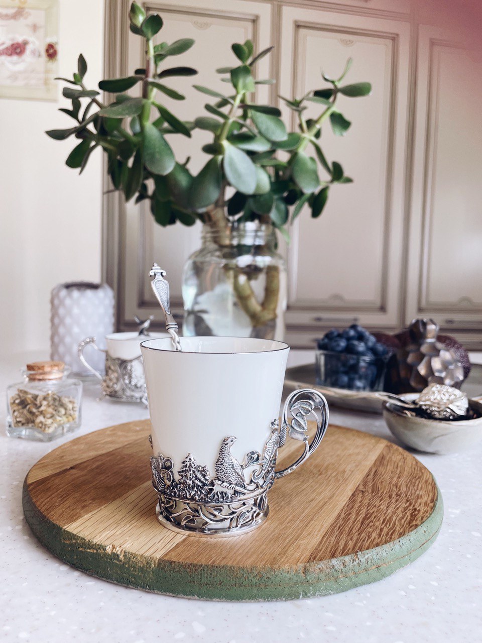 Чашка чайная "Тетерев" с ложкой продолжает нашу коллекцию на тему фауны. Данный набор для чаепития - это не только великолепный подарок на праздник, но и изумительное приобретение для себя. Внутри синего футляра находится фарфоровая чашка в серебряном основании, на котором выполнены искусные узоры. Также в комплект входит чайная ложка "Витая", обладающая необычными узорами и фигуркой на конце рукоятки, что придаёт набору аристократичный и элегантный вид.