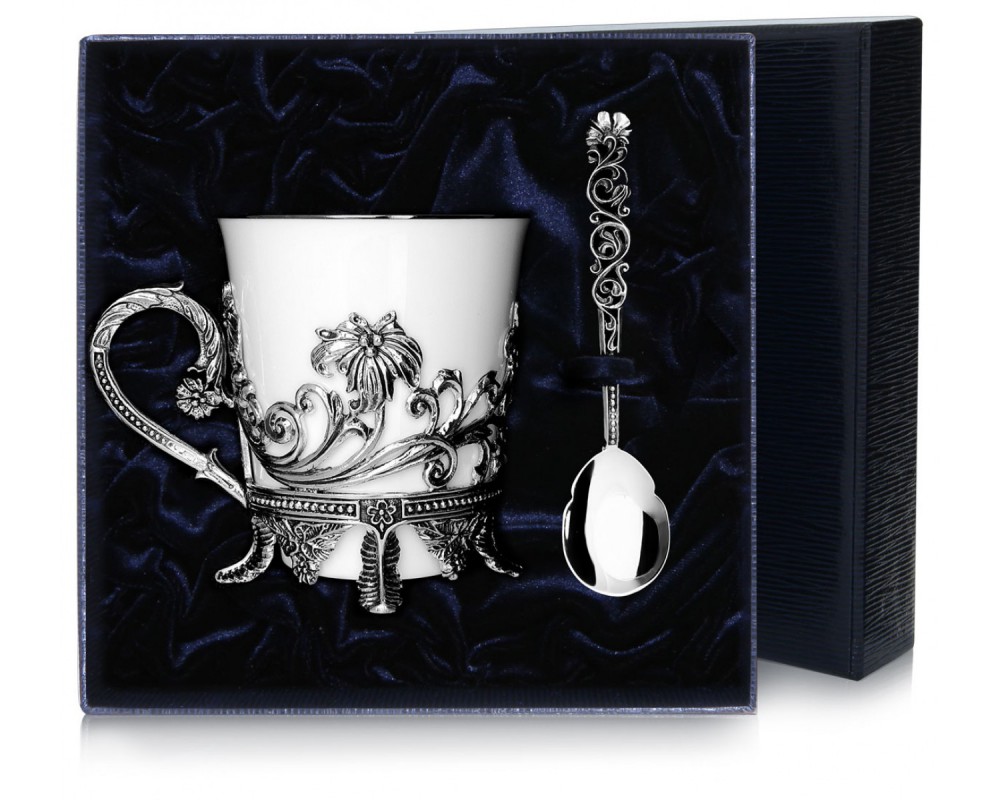 Чашка чайная "Цветочная" с ложкой - это поистине очаровательное дополнение праздничного или домашнего чаепития. Чашка имеет фарфоровою основу и серебряное основание, отличающееся изящнейшими растительными узорами, выполненными вручную. Также в наборе находится ложка, рукоятка которой выглядит как переплетение стебельков цветка. Чашка чайная "Цветочная" с ложкой прекрасно выполнит роль памятного подарка на абсолютно любое значимое событие. Все предметы упакованы в элегантный синий футляр.