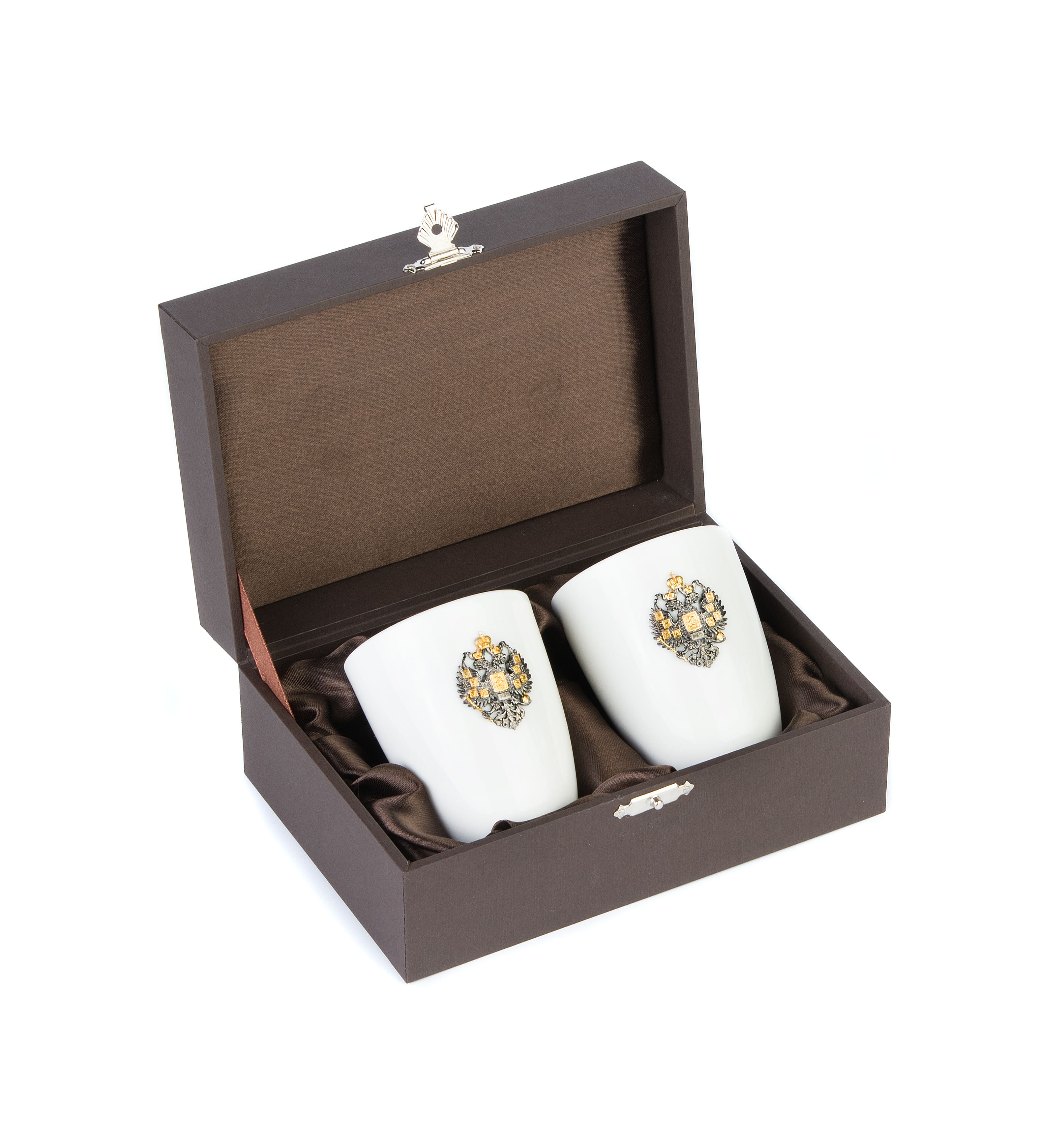 Чайные пиалы из фарфора превосходно сочетаются с серебряным украшением в виде герба царской России ручной работы.