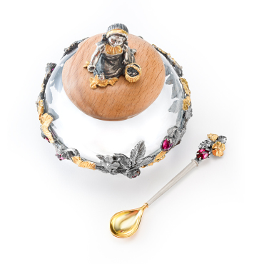 Сосуд сахарницы «Земляника» выполнен из термостойкого стекла украшенного серебром. Крышка изготовлена из дуба, пропитанного для придания водоотталкивающих свойств дереву, льняным маслом. Ягодки сделаны из девяти корунд-рубинов изящной огранки. Сахарница снабжена ложечкой. Детали выполнены вручную и в полной мере передают атмосферу русского леса, с его вкусными, спелыми, обильными дарами. Произведение займет достойное место в коллекции серебра или станет прекрасным подарком для ценителей ювелирного искусства.