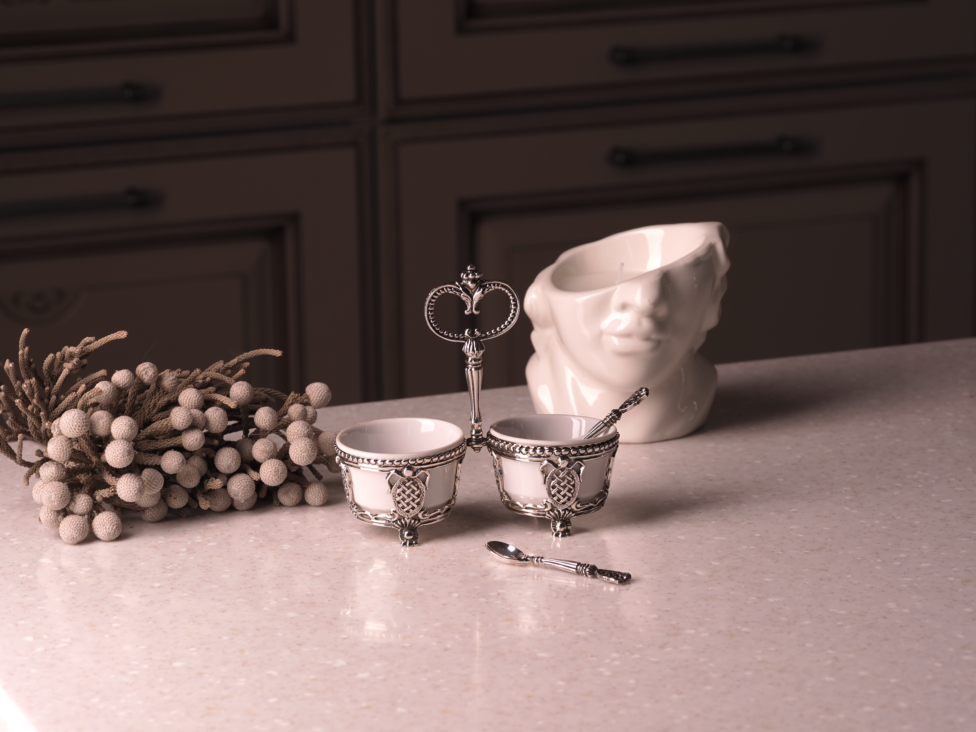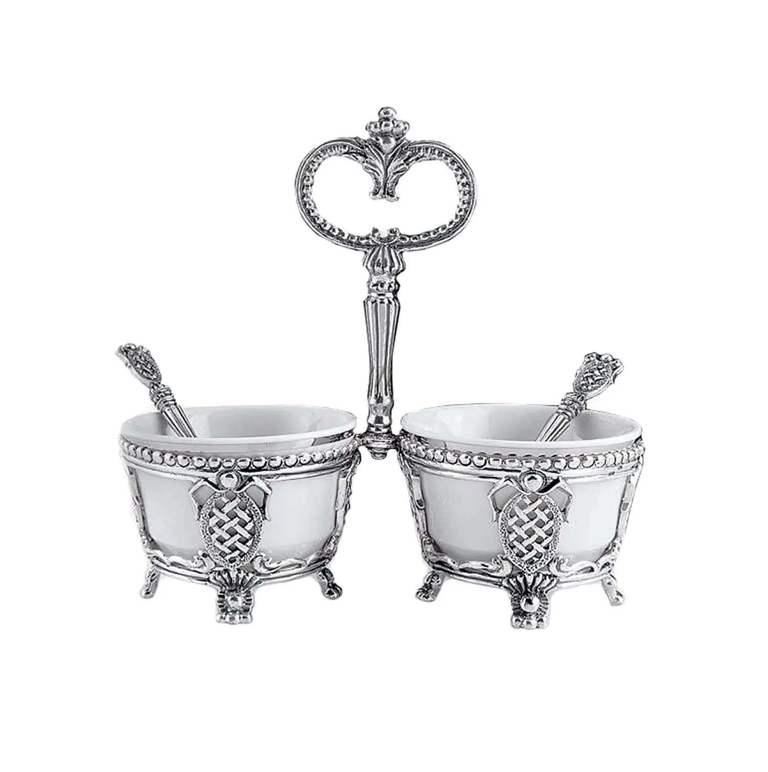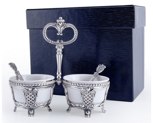 Набор для специй "Меценат" №2 - потрясающее дополнение обеденного стола. Сделанные из тонкого белого фарфора ёмкости вставлены в фигурные подставки из серебра 925 пробы с чернением, которые соединены между собой ручкой в форме ключа. Для удобства пользования каждая ёмкость дополнена небольшой серебряной ложкой для специй. Использование набора «Меценат» покажет присутствующим, что вы не оставляете без внимания любые мелочи, чтобы торжественный приём прошёл на высшем уровне. Кроме того, представленный набор может послужить прекрасным подарком, для чего мы предусмотрительно упаковали его в стильный тёмно-синий футляр.