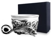 Фарфоровая солонка "Рыба" с чернением и с удивительной подставкой из серебра 925 пробы послужит оригинальным подарком и украсит любой стол. Подставка повторяет очертание рыболовных сетей, в которые попала большая рыба. Сначала кажется, что рыба и сеть - одно целое, но оказывается, что рыба - это рукоятка небольшой ложечки для удобства пользования солонкой.