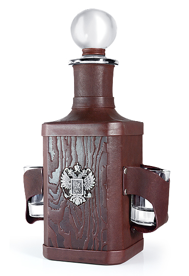 Стеклянный штоф вручную обтянут кожей натурального дубления с сохраненной естественной фактурой. Украшен серебряным гербом России высокой степени ручной проработки. Объем штофа – 750 миллилитров. Превосходный функциональный, привлекающий внимание, подарок.