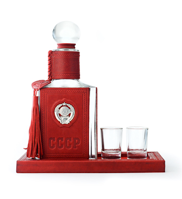 Красивый стеклянный штоф с двумя стопками "Ностальгия" дизайном напоминает настольный канцелярский набор времён СССР - именно эти четыре буквы вытеснены на красном кожаном футляре штофа и дополнены серебряным гербом Советского Союза. На горлышке штофа изображены символы СССР - серп и молот. Стильный подарок для того, кто с теплом вспоминает прошлое.