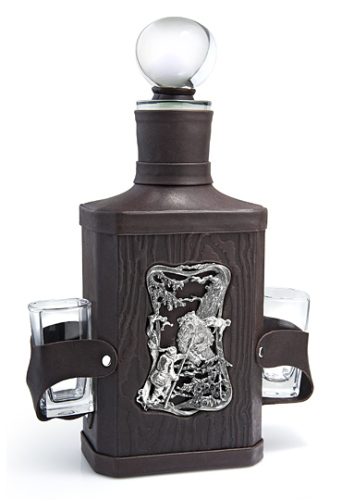 Стеклянный штоф "Охотничий" обтянут натуральной телячьей кожей с тиснением, максимально естественно повторяющий текстуру дерева, украшен серебряной плакеткой с охотничьим сюжетом. По бокам чехла кожаными захватами крепятся две стеклянные водочные стопки. Интересный, функциональный, привлекающий внимание подарок упакован в транспортировочную коробку.