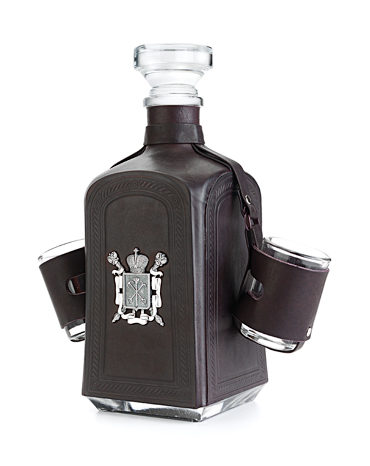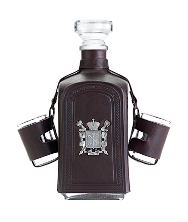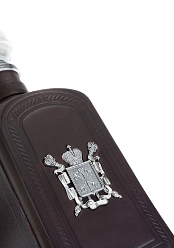 Стеклянный штоф "Санкт-Петербург" обтянут качественной натуральной кожей с тиснением. Он также украшен серебряной накладкой, изображающий герб Санкт-Петербурга. По бокам чехла кожаными захватами крепятся две стеклянные стопки объемом 40 миллилитров. Превосходный подарок, упакованный в транспортировочную коробку. О наличии товара уточняйте у операторов сайта.
