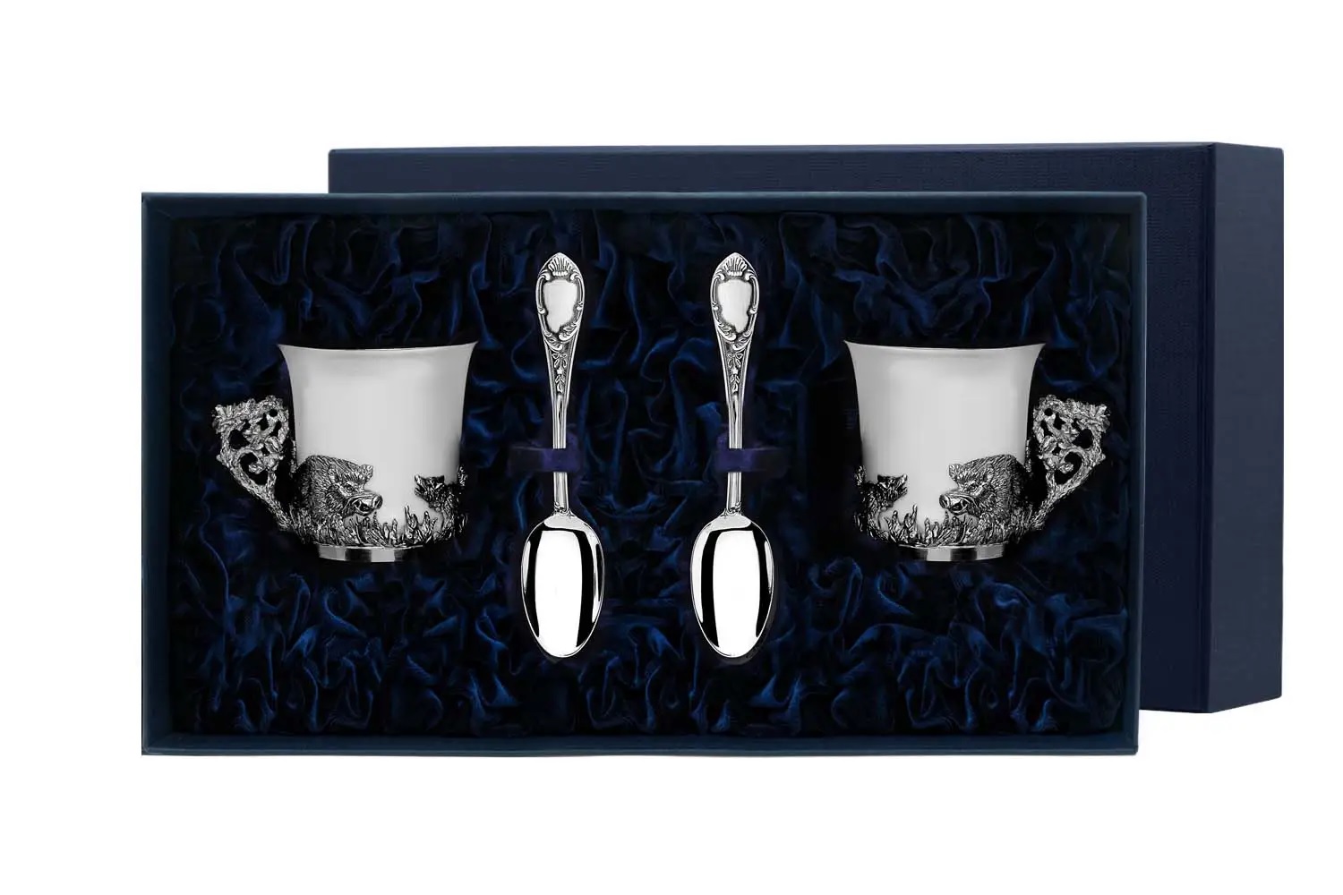 2 чашки кофейные "Кабаны" с ложками - это удивительный комплект, который прекрасным образом подойдет для подарка близким. В наборе представлены две чашки, основание которых выполнено из серебра и украшено изображением диких кабанов. Кофейные чашки выполнены их высококачественного костяного фарфора, отличающегося особой тонкостью. В тёмно-синем подарочном футляре на бархатной подложке вы также найдёте ложки "Престиж" украшенные изысканным узором на рукоятках, придающий элегантный вид.
