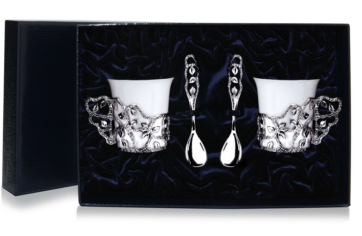 Кофейные чашки "Листопад" с ложками могут привлечь внимание, если вы ищете достойный подарок. Комплект состоит из двух фарфоровых кофейных чашек "Листопад" с ложками. Основания чашек и ложки изготовлены из серебра 925 пробы и выглядят необычно благодаря растительным мотивам в отделке. По ободку чашек также нанесён тонкий слой серебра. Для удобства транспортировки и вручения набор упакован в футляр.
