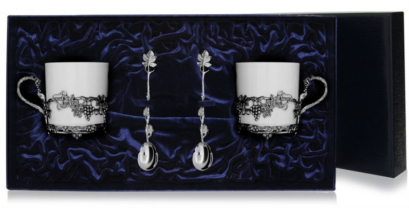 2 чашки кофейные "Виноград" с ложками - это потрясающий подарочный набор, который приятно вручить по любому случаю. Строгая форма фарфоровых кофейных чашек "Виноград" компенсируется нежным витым узором серебряных подстаканников 925 пробы и изящными кофейными ложками, украшенными по длине рукоятки виноградными листьями. Набор рассчитан на две персоны. Чашки упакованы в практичный футляр синего цвета.