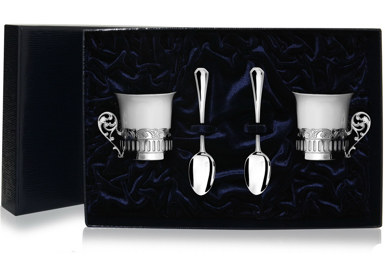 Серебряные кофейные чашки "Богема" с ложками - это набор для кофе на две персоны. Необычность данного комплекта в том, что здесь нет блюдец - фарфоровые чашки вставлены в серебряные основания с изящными ручками. В производстве использовано серебро 925 пробы. Набор упакован в удобный футляр с бархатной отделкой внутри и послужит не только украшением вашего стола, но и отличным подарком.