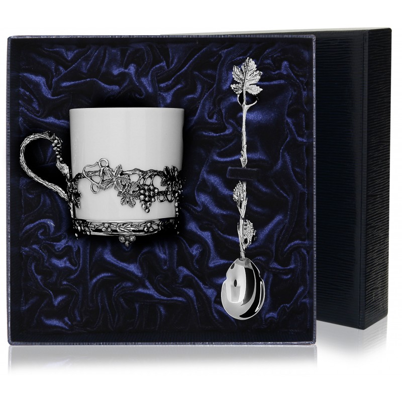 Чашка кофейная "Виноград" с ложкой может послужить замечательным подарком или украсить ваш стол. Строгая форма фарфоровой кофейной чашки компенсируется нежным витым узором серебряного основания и изящной кофейной ложкой, украшенной по всей длине рукоятки виноградными листьями. Набор упакован в аккуратный футляр, удобный для транспортировки и вручения подарка.