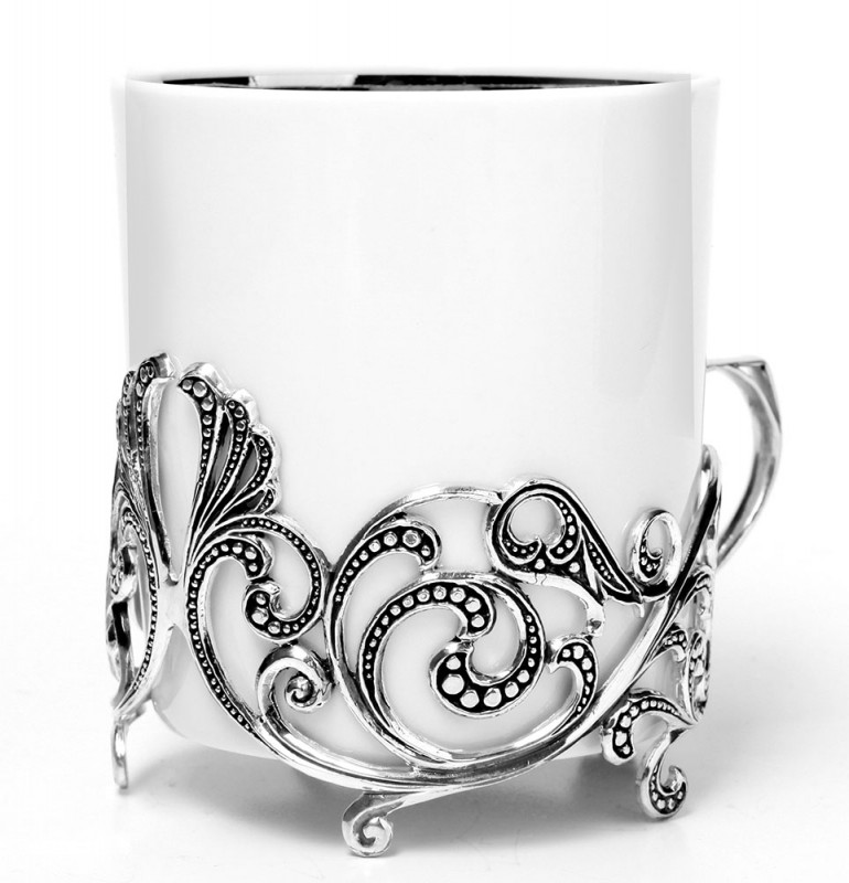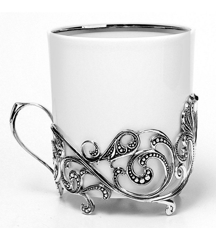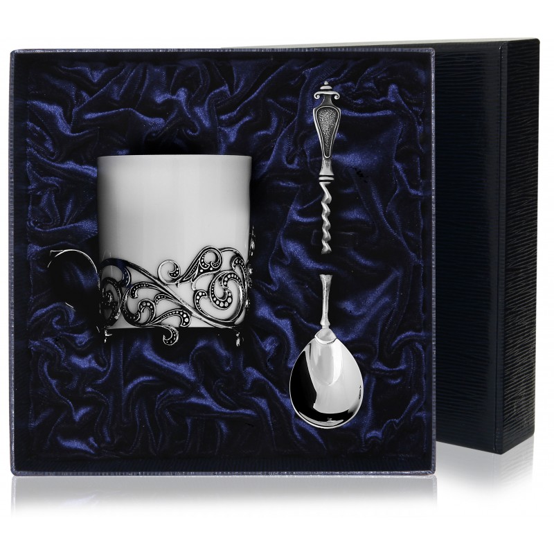 Чашка кофейная "Витая" с ложкой, упакованные в тёмно-синий футляр, послужат достойным подарком и будут радовать взгляд. Белая фарфоровая чашка с серебряным ободком изнутри, вставленная в красивейшее основание на изящных ножках, и серебряная кофейная ложка с рукояткой необычной формы притягивают к себе внимание безупречностью изготовления. В работе использовано серебро 925 пробы.