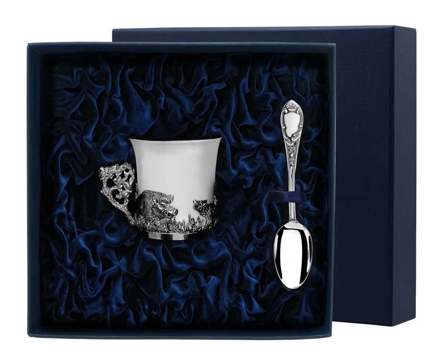 Чашка кофейная "Кабаны" с ложкой в тёмно-синем подарочном футляре на бархатной подложке удачно дополняет нашу лесную коллекцию и может быть преподнесена в дар сама по себе или в комплекте с чашками "Зайцы" и "Глухари". Комплект "Кабаны" состоит из кофейной чашки в серебряном основании и кофейной ложки классической формы. Для изготовления набора использовано серебро 925 пробы.