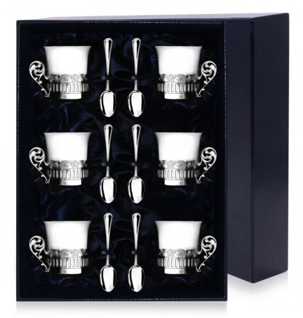 Набор "Богема " - это 6 кофейных чашек и ложек. Фарфоровые чашки вставлены в серебряные основания, с изысканной ручкой, узоры которой повторяют растительные мотивы. В наборе также представлены кофейные ложки из коллекции "Элегант". Рукоятки ложек декорированы лаконичными узорами, благодаря которым застолье обретет уютную атмосферу. Все предметы упакованы в удобный подарочный футляр.