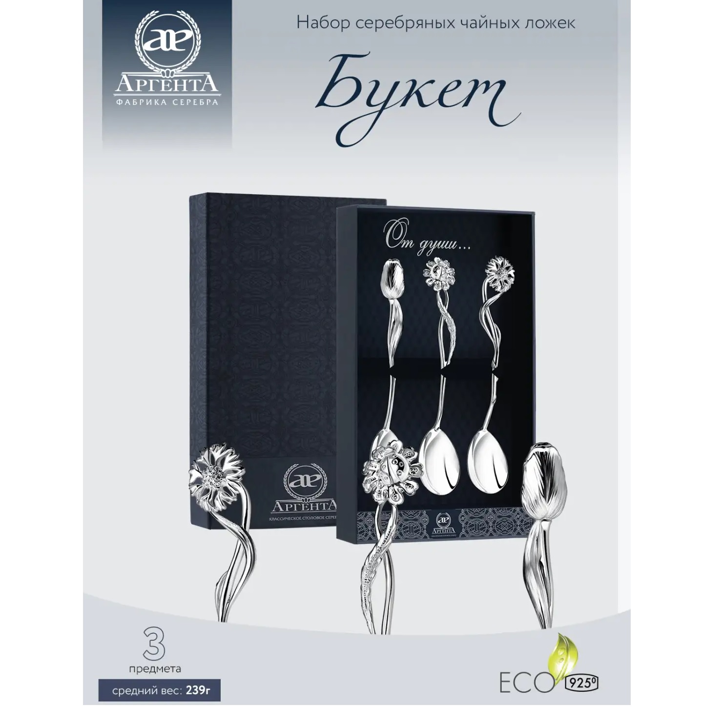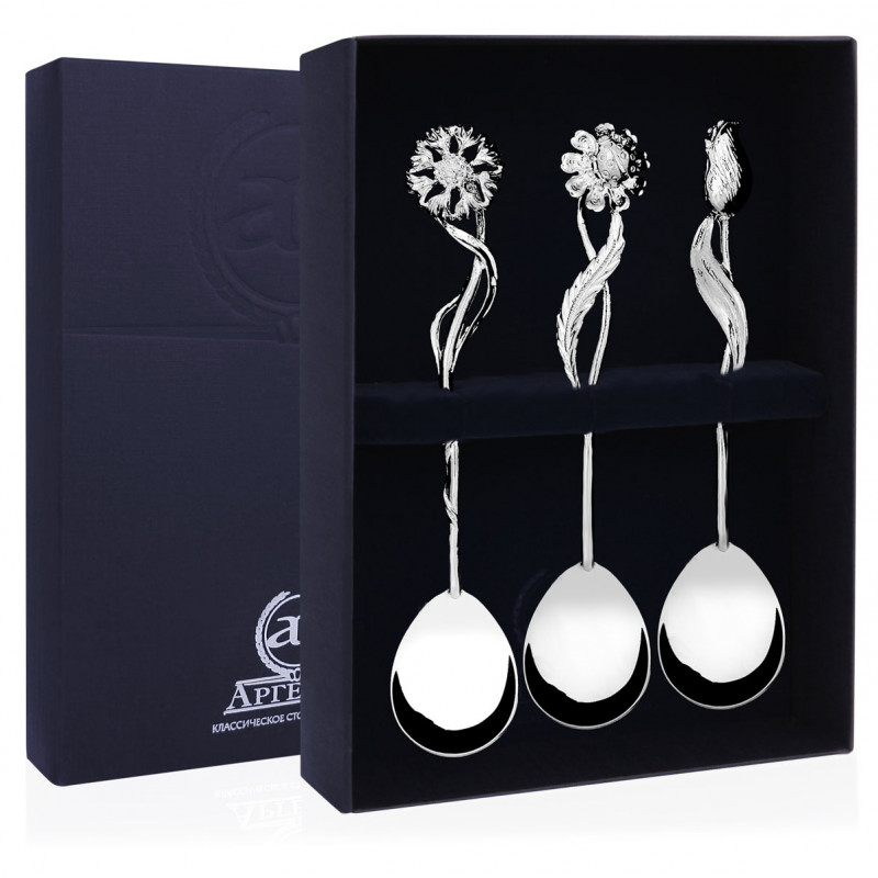 Серебряный набор "Букет" - это 3 чайные ложки, каждая из которых имеет уникальный дизайн. На рукоятках изображён один из трёх цветков, растущих на необъятной территории России - ромашка, тюльпан или нарцисс. Упаковано в темно-синий футляр. Удивительный дизайн ложек придаст домашний уют Вашему чаепитию.