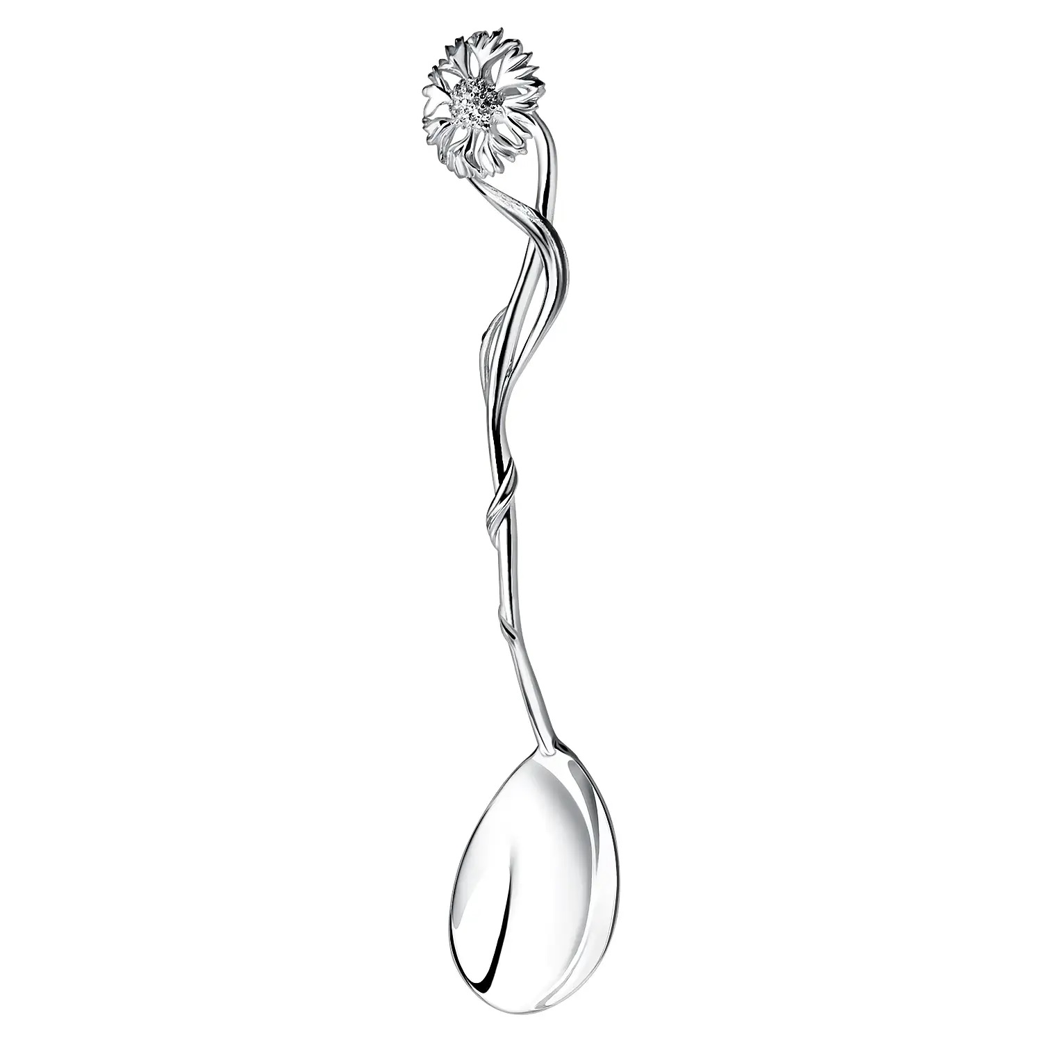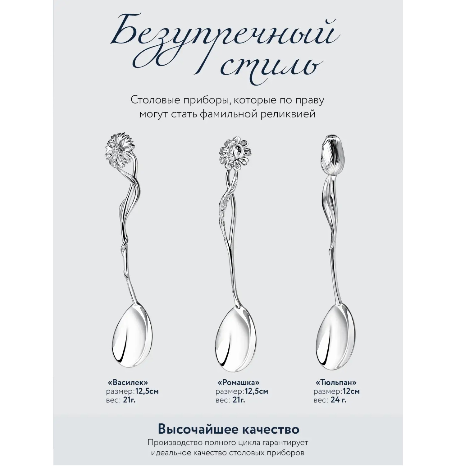 Серебряная чайная ложка "Василек". Длина - 13 см, ширина - 2.5 см. Артикул: