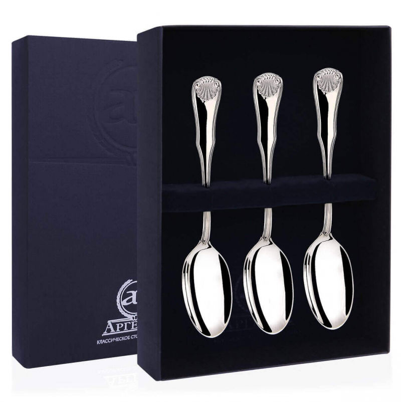 Серебряный набор "Визит" - это 3 чайные ложки, сделанные из серебра. На рукоятках выполнены изысканные узоры в стиле барокко в виде ракушек, что придает застолью аристократический дух. Подойдёт в качестве особого, ценного подарка для близких, коллег, бизнес-партнеров и друзей. Станет прекрасным украшением праздничного стола и домашнего чаепития.