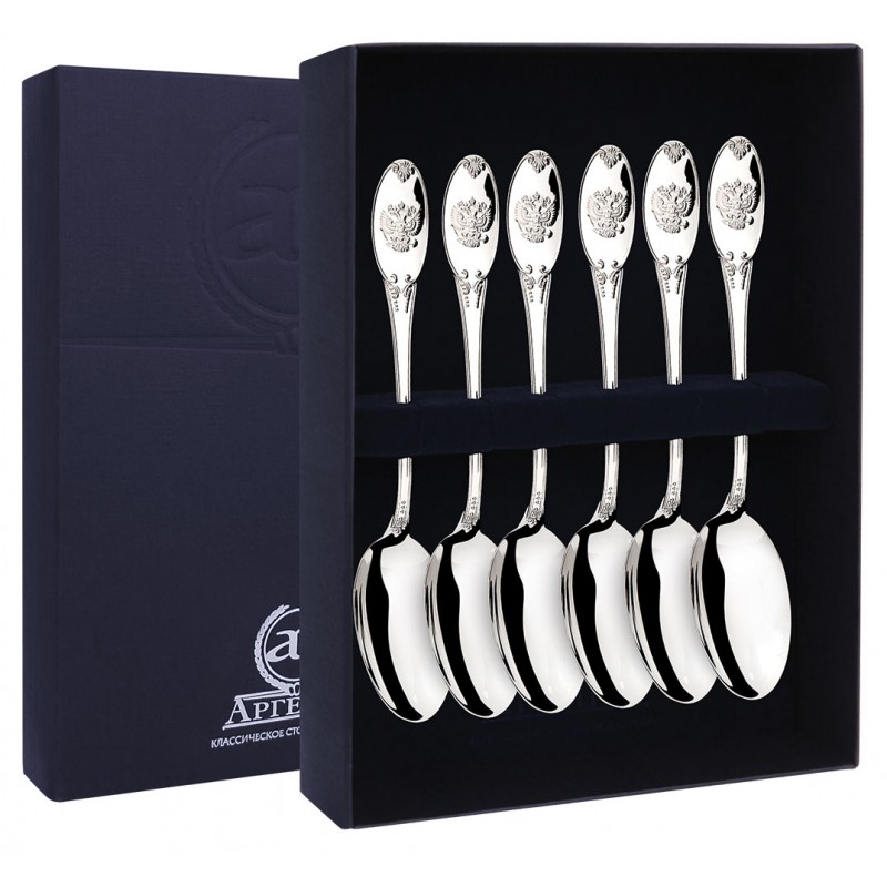 Серебряный набор "Единство", состоящий из 6 чайных ложек, упакован в тёмно-синий праздничный футляр. Узоры, которые украшают рукоятки ложек для чая, украшены изображением символа государственности Российской Федерации - гербом, благодаря чему праздничный стол обретет торжественную и строгую атмосферу. Серебро также поможет владельцу позаботиться о своем здоровье, так как оно обладает природным антисептическим свойством.