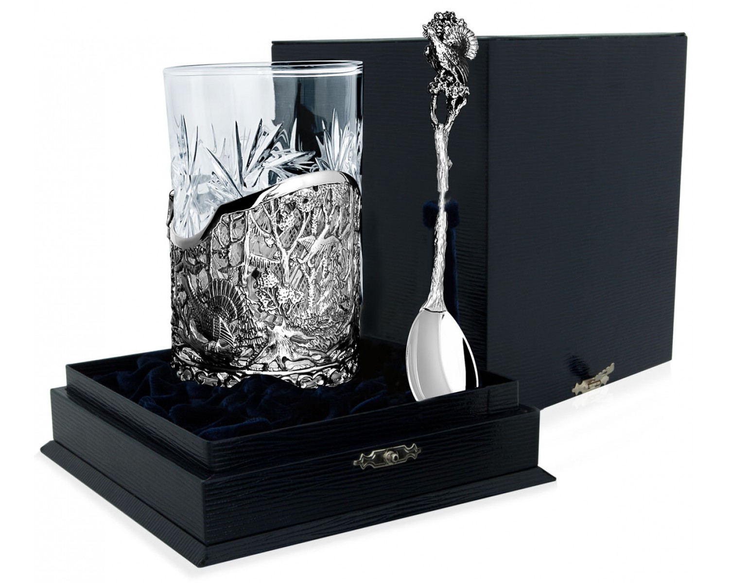 Серебряный подстаканник "Глухариная охота" литой с ложкой дополнен хрустальным стаканом. Подстаканник и ложка выполнены из серебра 925 пробы с особым изяществом методом литья с чернением, оба предмета посвящены лесной теме. Хочется обратить особое внимание на ложку: её рукоятка отлита в виде веточки с сидящей на ней фигуркой глухаря. Набор упакован в удобный для транспортировки и дарения футляр.