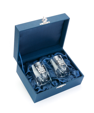 Каждая стопка, вмещающая 60 миллилитров, украшена гербом ручной работы.