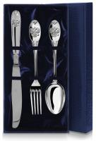 Набор столового серебра «Единство» включает в себя 3 предмета: вилку, нож и столовую ложку. На рукоятки столовых приборов нанесена тонкая отделка в виде герба Российской Федерации. Серебряный набор "Единство" украсит Ваш стол или станет чудесным подарком для бизнес-партнеров, коллег и родственников.