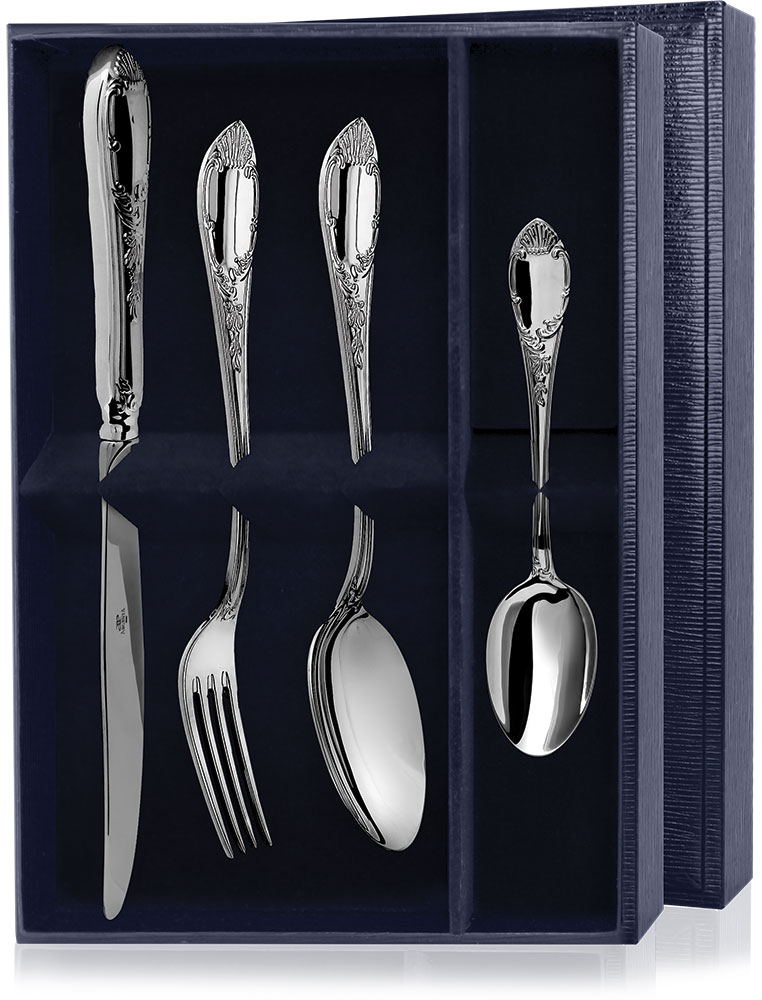 Набор столового серебра «Эгоист-Престиж» - это классический комплект столового серебра на одну персону. В тёмно-синем стильном футляре находятся чайная ложка, вилка, столовая ложка и нож. Рукоятки приборов украшены аккуратными и тончайшими узорами. Серебряный набор - прекрасный подарок для родных людей или бизнес партнеров.