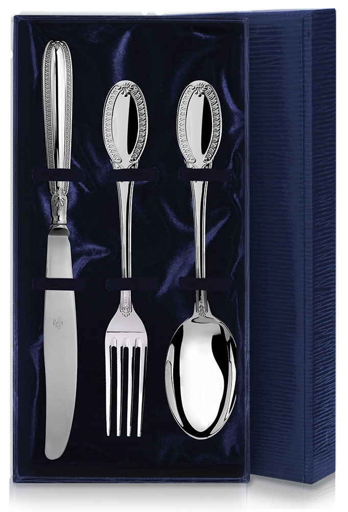 Серебряный набор "Император" - это 3 предмета, необходимых на обеденном столе предмета - нож, вилка и столовая ложка. Необычные и лаконичные узоры на овальных рукоятках приборов - внешний вид поможет подчеркнуть торжественность обеда или приёма. Комплект подходит как подарок для ваших любимых, родных, близких или коллег. Упаковано в синий футляр темного оттенка.