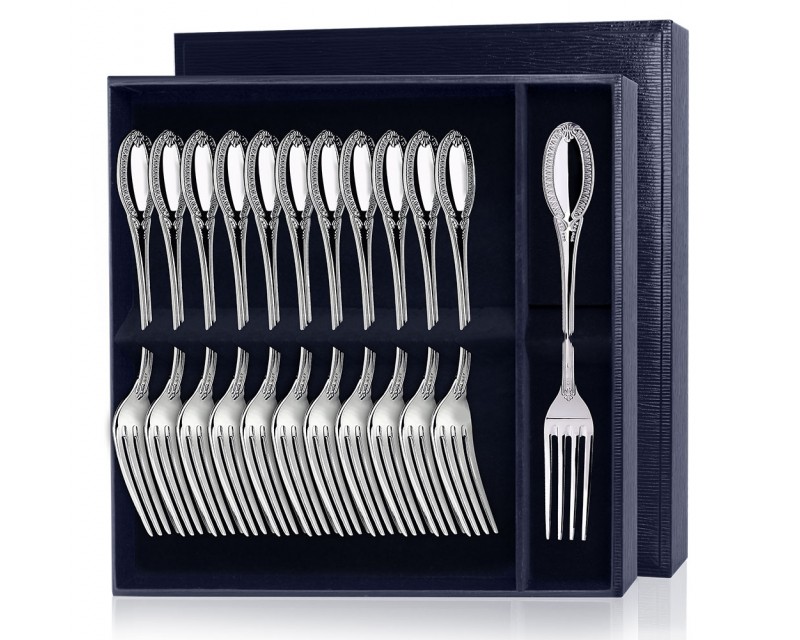 Серебряный набор столовый "Император" 12 предметов включает в себя двенадцать столовых вилок. Комплект приборов упакован в футляр с гребёнкой-разделителем. Все рукоятки изделий украшены классическим узором. Данный комплект послужит великолепным украшением стола и подарком для любимых. Проба серебра, из которого выполнен набор - 925.