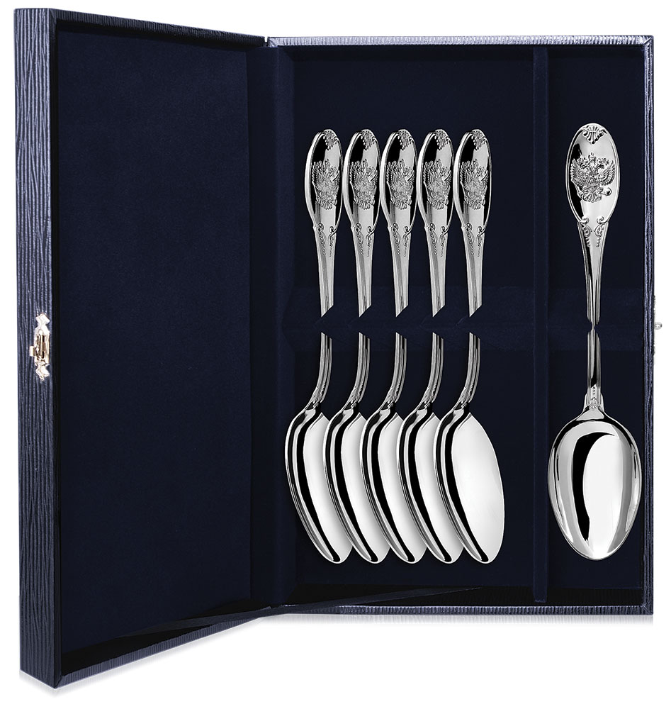Серебряный набор "Единство", состоящий из 6 чайных ложек, упакован в тёмно-синий праздничный футляр. Узоры, которые украшают рукоятки ложек для чая, украшены изображением символа государственности Российской Федерации - гербом, благодаря чему праздничный стол обретет торжественную и строгую атмосферу. Серебро также поможет владельцу позаботиться о своем здоровье, так как оно обладает природным антисептическим свойством.