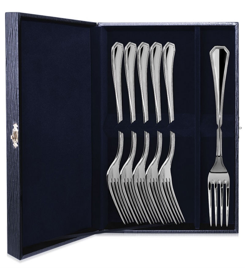 Серебряный набор "Элегант" - это 6 столовых вилок, покрытых изысканными классическими узорами на рукоятках, благодаря которым столовое серебро приобретает дорогой и аристократический вид. Набор упакован в элегантный синий футляр с защелкой. Станет запоминающимся подарком для любимых родственников, коллег и начальства. Стильное дополнение праздничного стола.