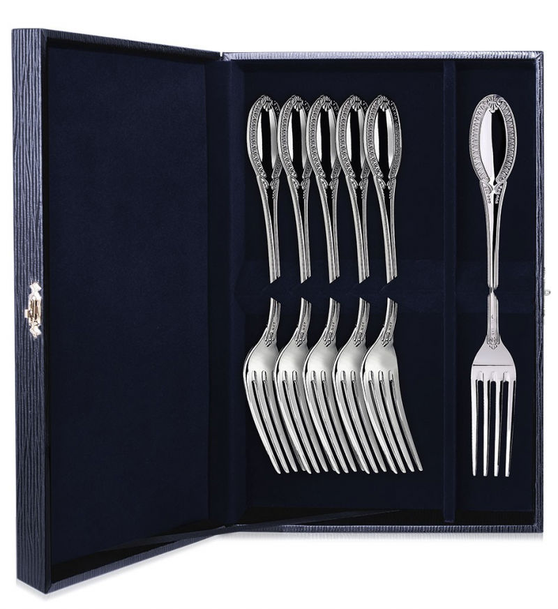 Серебряный набор "Император" - это потрясающий набор столового серебра, который придаст застолью по-настоящему торжественную атмосферу. В футляре располагаются 6 столовых вилок, искусно выполненных из серебра российского происхождения 925 пробы настоящими мастерами своего дела фабрики "Аргента". Овальные концы рукояток обрамлены тонкими витыми узорами, благодаря которым столовые приборы приобретают строгий царственный вид. Подойдет для подарка для родных людей и близких друзей на знаменательный день.