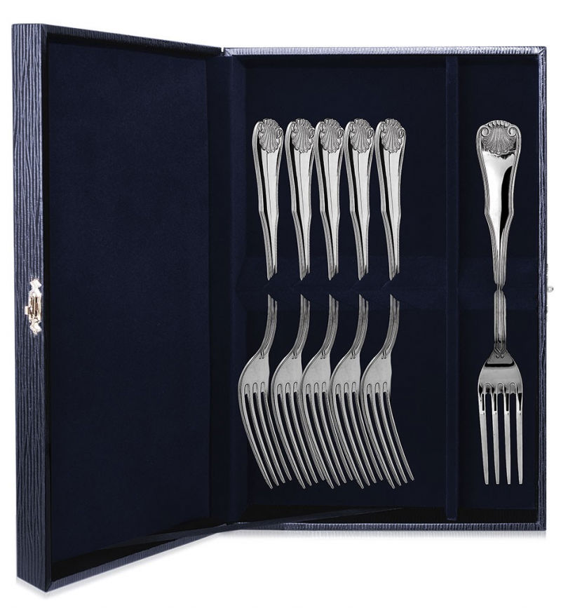 Серебряный набор "Визит" - это 6 столовых вилок. Предметы сделаны из высококачественного серебра пробы 925. Выполнены искусными мастерами на фабрике "Аргента". Рукоятки вилок покрыты элегантным витым узором в стиле барокко. Комплект упакован в праздничный синий футляр, который прекрасно подходит для вручения подарка.