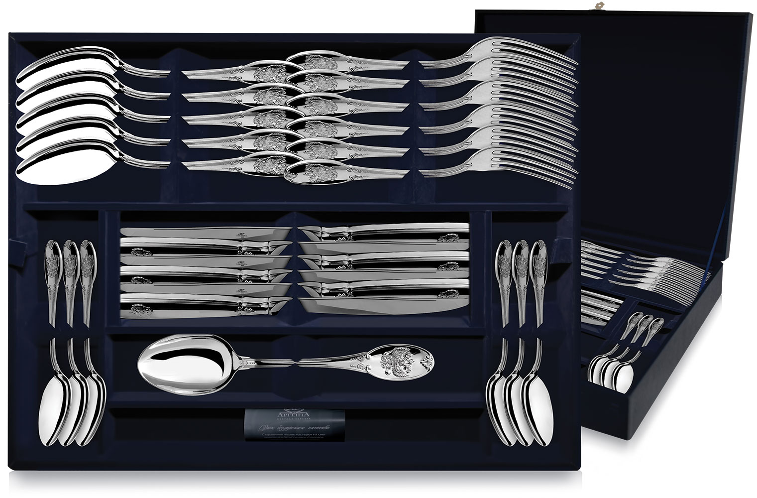 Серебряный набор столовый "Единство" 24 предмета на 6 персон придаст столу роскошный вид, благодаря изящно исполненному изображению герба РФ - двуглавого орла, выполненному на рукоятках приборов. Орел держит державу - символ государственности и скипетр - символ власти. Комплект состоит из столовых и чайных ложек, ножей, а также вилок. Набор упакован в синий практичный футляр. Послужит великолепным подарком к любой памятной особой дате и украсит как дружеский, так и деловой обед.