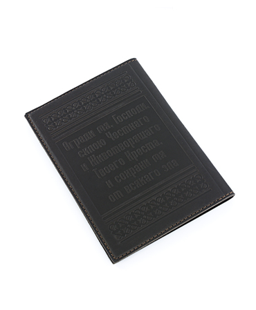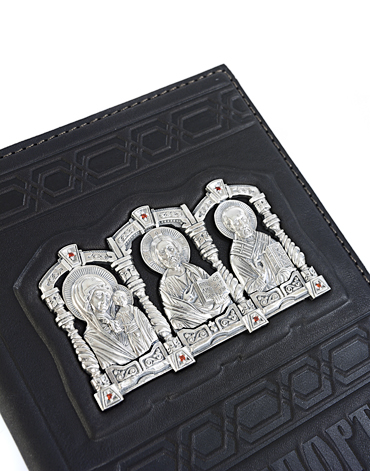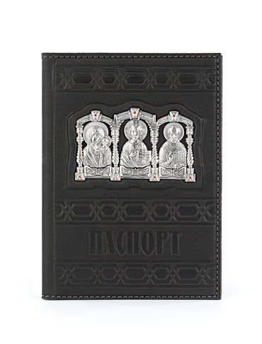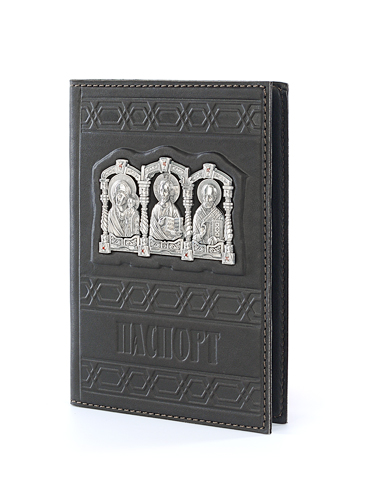 Православная обложка для паспорта «Оберег» выполнена вручную из телячьей кожи и украшена украшена серебряным триптихом. В центре — икона Спас Вседержитель. Слева от Спасителя образ Казанской Божией Матери — помощницы во всех житейских делах, утешительницы и заступницы. Справа — икона Святителя Николая, покровителя всех путешественников.